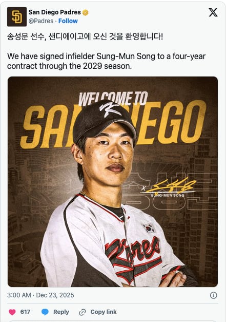[오피셜] "송성문 선수 샌디에이고에 오신 것을 환영합니다" SD, 송성문 4년 222억 계약 공식 발표