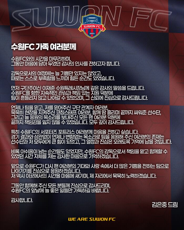 '샤프'김은중 감독의 수원FC 이별사"믿어준 팬,선수,구단에 감사"[전문]