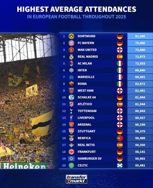 '2025 평균 관중=경기장 전체 수용 인원' 평균 관중 1위의 위엄...맨유 3위-레알 4위