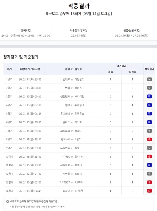 베트맨, 3월 16일(월) 축구토토 승무패 18회차 적중결과 발표