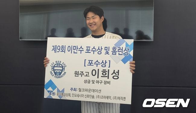 [OSEN=도곡동, 한용섭 기자] 프로야구 NC 다이노스가 2026 신인드래프트에서 2라운드로 지명한 포수 이희성(원주고)이 제9회 이만수 포수상을 수상했다. 1회 이만수 포수상 수상자가 NC 주전 포수로 성장한 김형준이다. 이희성은 “김형준 선배를 따라가고 싶다”고 말했다.