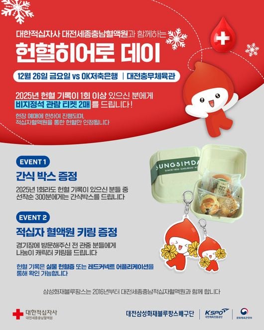 헌혈하면 무료 초대권 준다! 삼성화재, 대한적십자사 대전세종충남혈액원과 '헌혈히어로' 개최