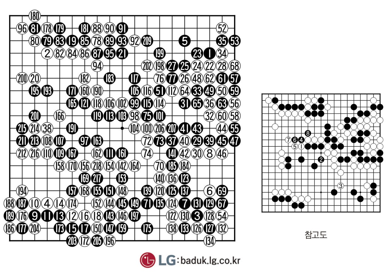 <총보>(1~218)=25회 LG배 챔피언 신민준이 메이저 세계 대회 첫 결승을 노린 쉬하오훙을 돌려세우고 두 번째 우승을 향한 포석을 완료했다. 출발은 매끄럽지 않았다. 판단을 그르친 38로 인해 먼저 수세에 몰렸다. 54는 제1 승부수. 69까지 우변 패의 결과로 흑이 우세를 잡았다.